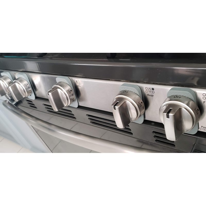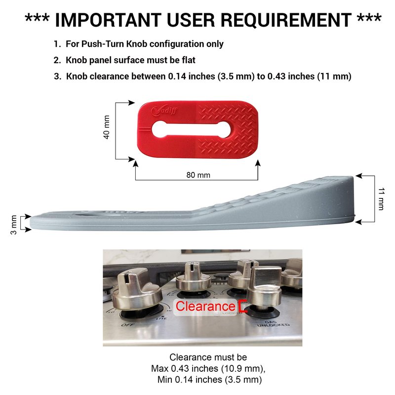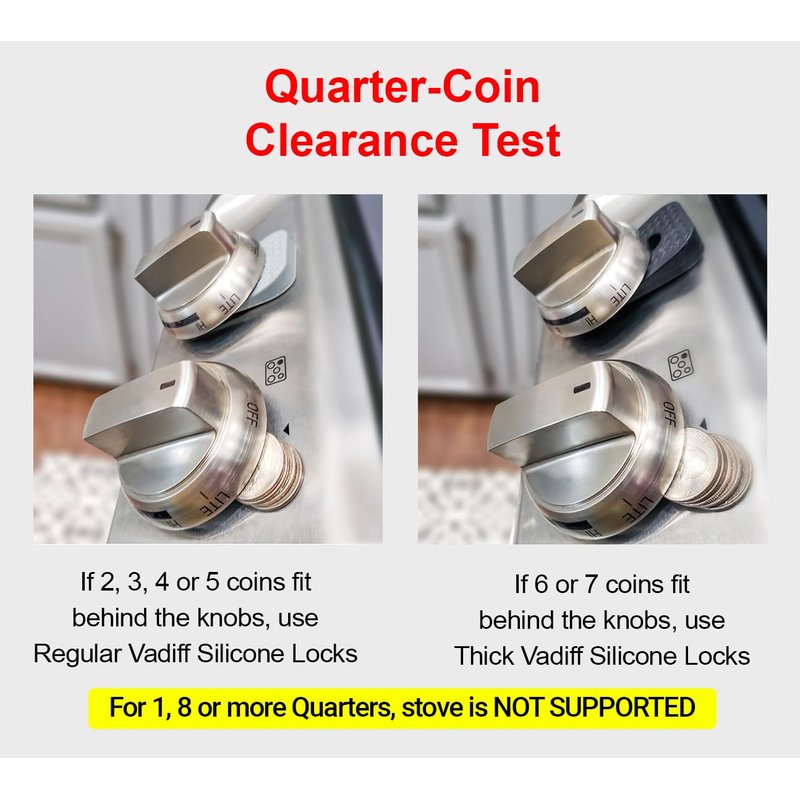 *** IMPORTANT *** 1. Perform the Quarter-Coin Slide Test below before purchase. 2. Verify that your stove is supported - check the unsupported knob types in the product images. 3. Clean the area behind the knobs to ensure the locks do not slide/move when locked. 4. If Locks block oven door when cooking, slightly tuck Locks behind the knobs. VADIFF KNOB SAFETY LOCK FEATURES - Protects your loved ones. It prevents babies, toddlers, pets, elderly, and you from accidentally turning ON the burner/oven causing possible gas leaks or fire - This new innovation in kitchen safety provides a visual reminder that the stove/oven is ON. A quick glance of the knob locks could make a huge difference in your home. - Solves current problems in knob safety products: last long, doesn't break, convenient to use, fits most knobs - Safe: BPA-free, food-grade silicone - Easy to Clean: Stain and odor resistant - Durable: Doesn't break, doesn't need tools or adhesives, heat resistant to 230 degrees C - Blends with any kitchen decor - Customizable COLOR - Red, Gray, Black, Blue - Gray (Thick) PACKAGING - Contains 5 Safety Knob Locks - Frustration-free, recyclable PRODUCT SPECIFICATION Vadiff Locks are designed for all size knobs, gas or electric, with the following knob types: - Push-Turn operation - Flat panel surface - Knob clearance between 0.14 inches to 0.39 inches *** QUARTER-COIN SLIDE TEST *** Slide a stack of 2 quarter coins behind the knobs. Next, add 1 coin to the stack. Continue inserting coins without displacing knob. If 2 - 5 slide through, choose regular Locks. If 6 or 7 slide, choose the THICK Locks. Over 7, not supported. Protect Your Family. Protect Your Home.