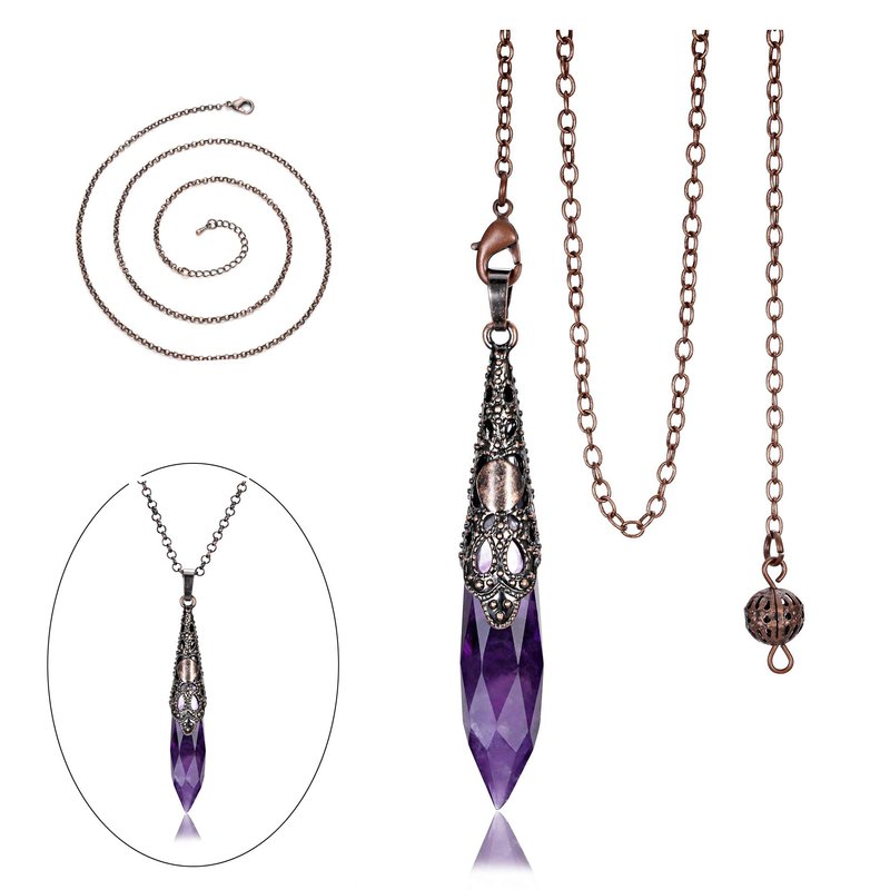 - [Reiki Crystals Pendulum] The pendulum is made of natural crystal stone, which cut design is very delicate with antique bronze tone vintage lace pattern. With 2 bronze stainless steel chains for pendulum or pendant necklace. It can be used as a beautiful pendant necklace for daily wearing or as dowsing pendulum for witchcraft and divination.