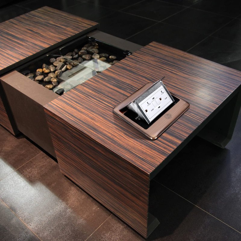 A pop up outlet box is hidden in your countertop or floor when closed, all you see is a stylish Bronze top. When you push the button the top tilts open revealing the outlets.