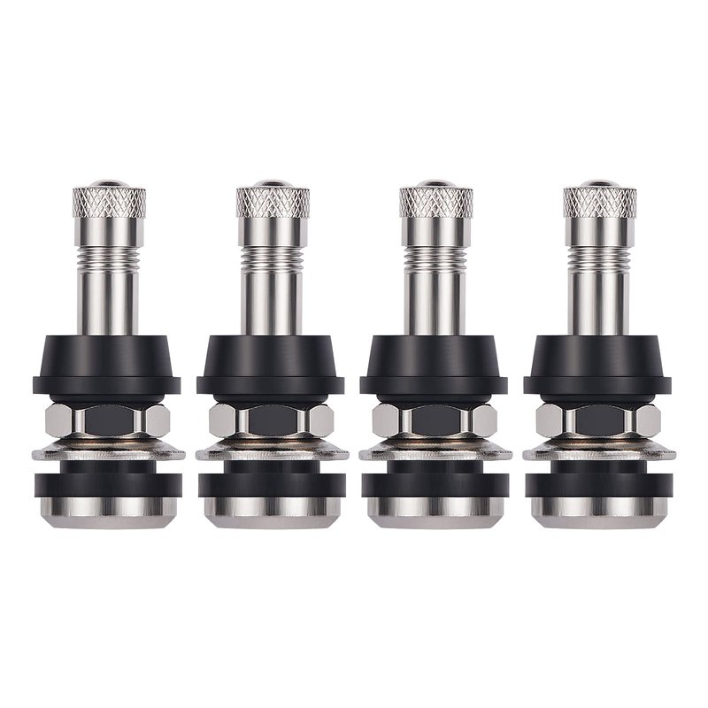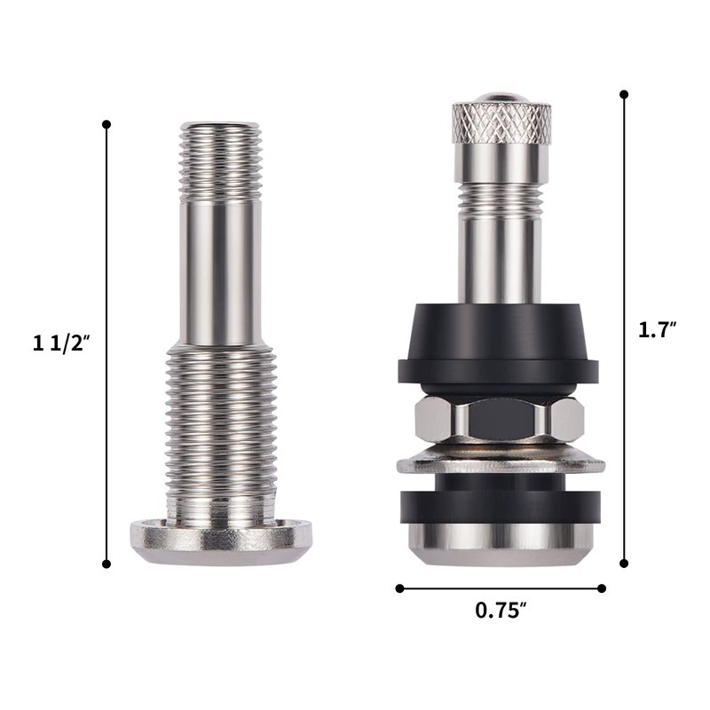 Model: TR416 Color: Silver Quantity: 4 PCS TR416 Metal Valve Stems Material: nickel plated brass, EPDM rubber Effective Length: 1 1/2" inch Complete Size: 1.7" L x 0.75" W Recommend: Before placing an order, you have to match the valve size to the hole in and thickness of the rim and make sure you do not excede the PSI rating of the valve. How to Replace Valve Stem 1.Identify whether or not the valve stem to be replaced has a TPMS. These valve stems will not fit the wheel with TPMS. 2.Identify whether the valve stem to be replaced is a high pressure valve stem. 3.Deflate the tire. 4.Before inserting the valve stem, you can lubricate it. 5.Push the old valve stem through the rim and remove the valve stem from the wheel. 6.Choose which one of the black rubber grommet you need. Insert the new metal valve stem from inside the rim and pull through until the rubber grommet is seated. 7.Seat the tire and inflate.