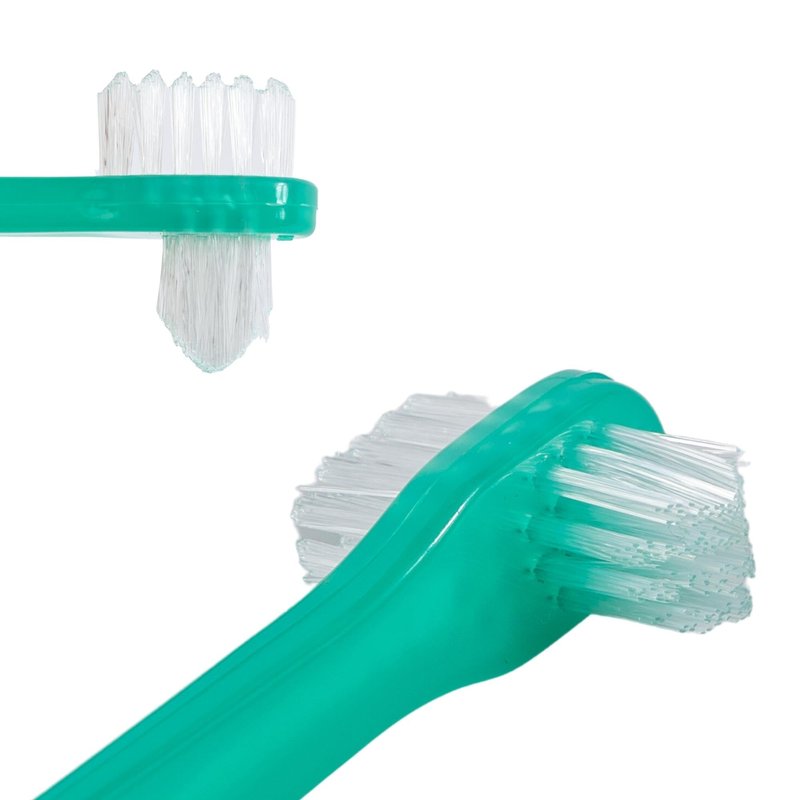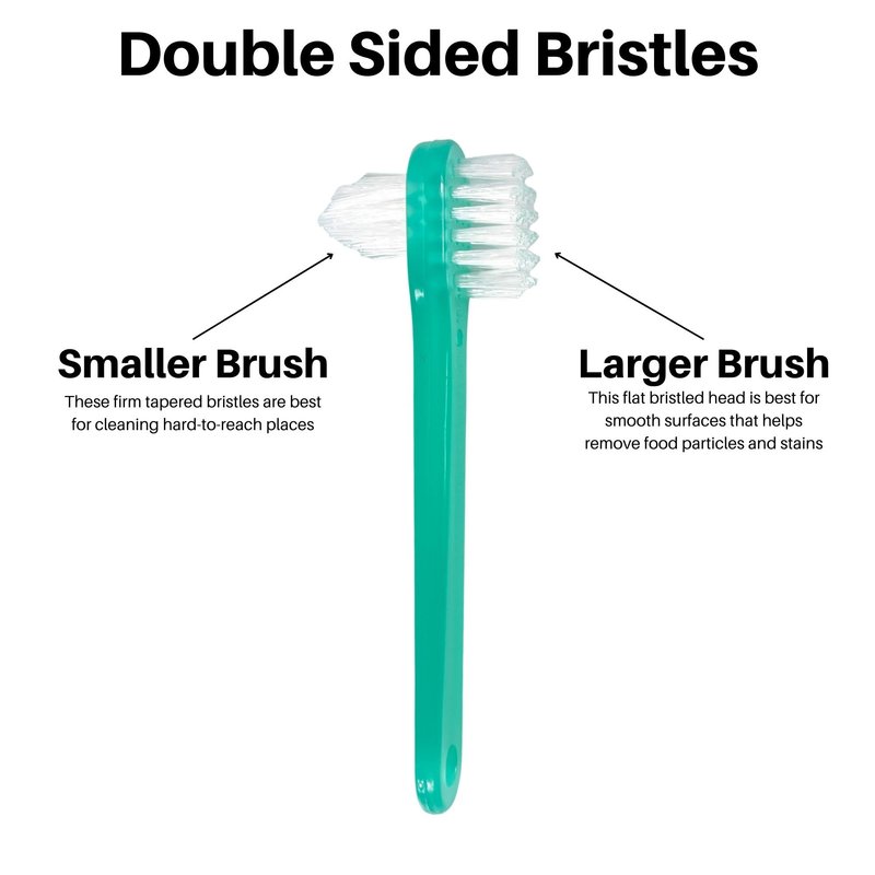 - TWO-SIDED -Each denture brush features double ended bristles. One side has a larger flat bristled head, for smooth surfaces that helps remove food particles and stains. The other side has a smaller brush with firm tapered multi-layered bristles that allows for cleaning hard-to-reach spaces.