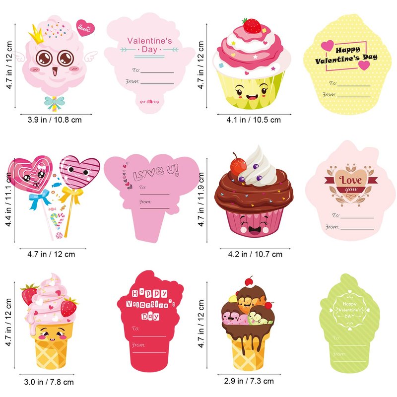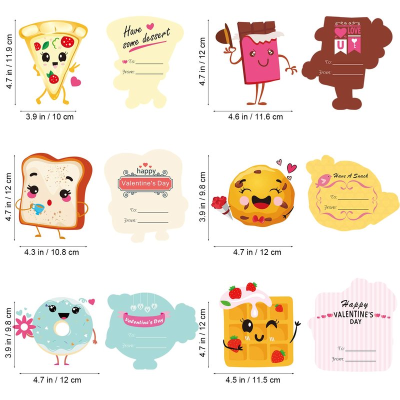 - š12 Different Snack Shape Patterns - With 12 different designs, 3 pieces for each pattern, this kids Valentine Day Cards set features snack shapes like lollipops, strawberry ice-cream, chocolate ice-cream, Chocolate, Marshmallow, strawberry cupcake, cookies, donuts, pizza, waffles, toast, and Chocolate cupcakes.