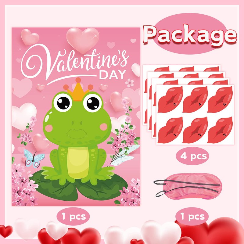 - 【VALENTINE DAY GAMES FOR KIDS PACKAGE CONTENT】: 1 piece poster (23 x 17 inch), 24 pieces reusable frog mouth, 1 piece pink eye mask,1 sheet glue dots.The sufficient quantity can meet your different needs, is nice for playtime with kids, classmates or family.