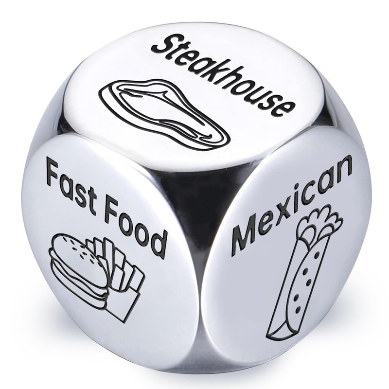 - Date Night Gift Idea: It is made of stainless steel;engraved with six different food choice; engraved lettering is clear and easy to read, If you want to try something new or adventurous on your date, let food dice or date dice make the decision for you