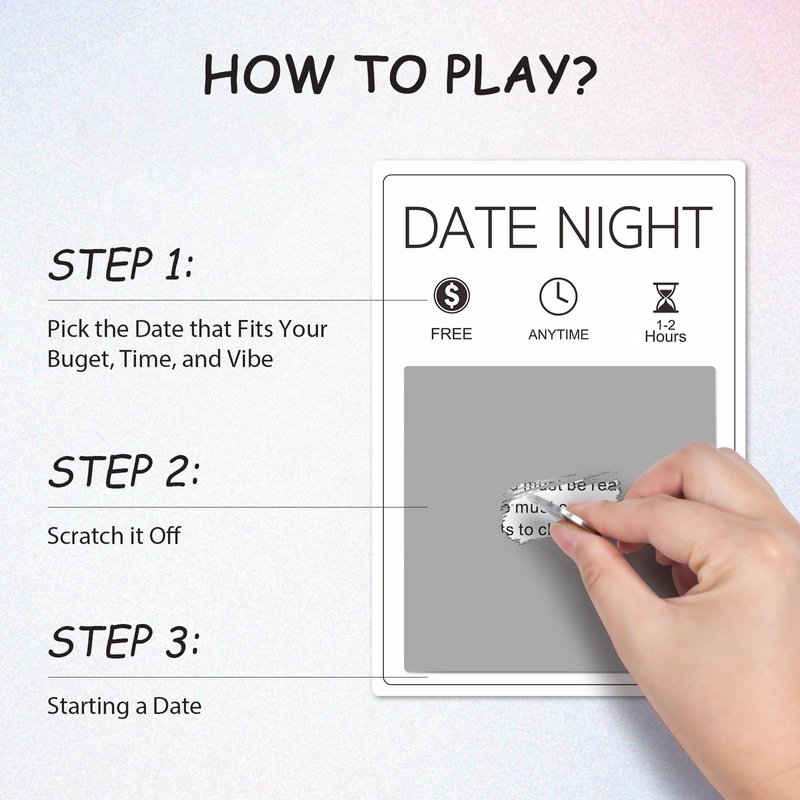 - Easy to Play: Perfect for all kinds of couples. Before you scratch each card use the hints to help you better anticipate what type of date awaits. Simply scratch off a card while playing this dating couple game, let the adventure begin and complete the date activities