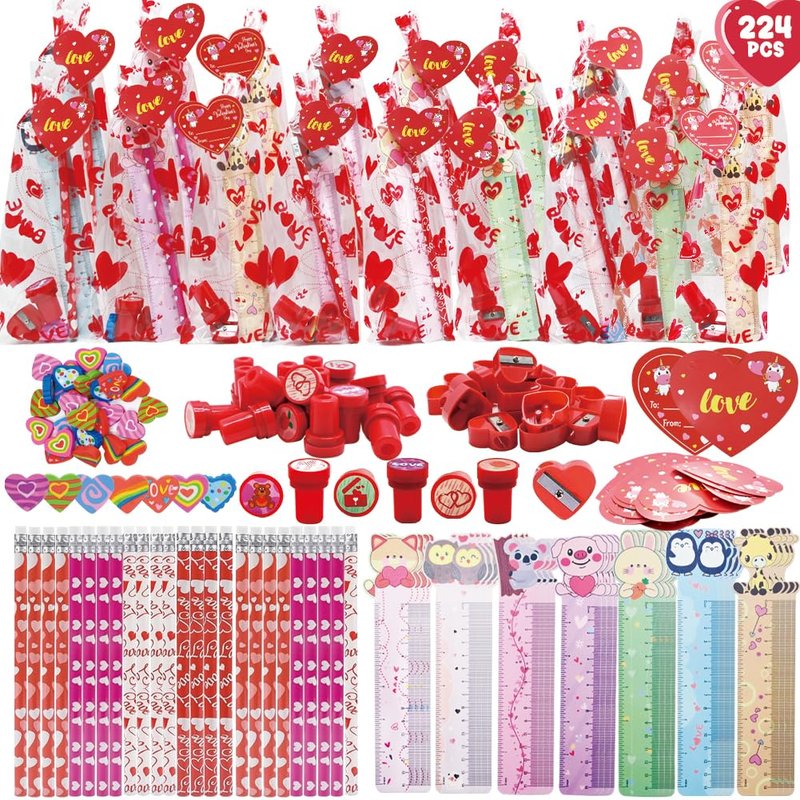 Valentines Day Gifts for Kids Classroom, 224 PCS Valentines Day Stationery Set with Pencils, Erasers, Rulers, Sharpeners, Cards for Kids Valentines Day Classroom Exchange, Valentine Party Favors