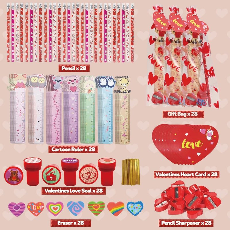 - SUPER VALUE PACK: Valentines day stationery set with 28 valentine pencils, 28 rulers, 28 erasers, 28 heart shaped cards, 28 pen sharpeners, 28 valentines seals, 28 gift bags and 28 ropes. There are many kinds and quantities of stationary, super value package for you.