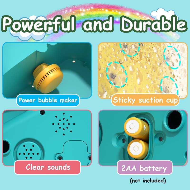 - 【Waterproof&Super Sticky】Musical bubble machine made of high quality ABS, IP6 waterproof protection, unlocking more usage scenarios: bathtub, pool, outdoor. Smooth surface, does not hurt your hands. Upgraded suction cups easily adsorbed on smooth surfaces, super adhesive, not easy to fall off