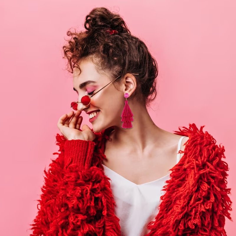 - Bohemian Chic: Our pink layered tassel earrings showcase a trendy boho design, adding a touch of fashion-forward charm to your look.