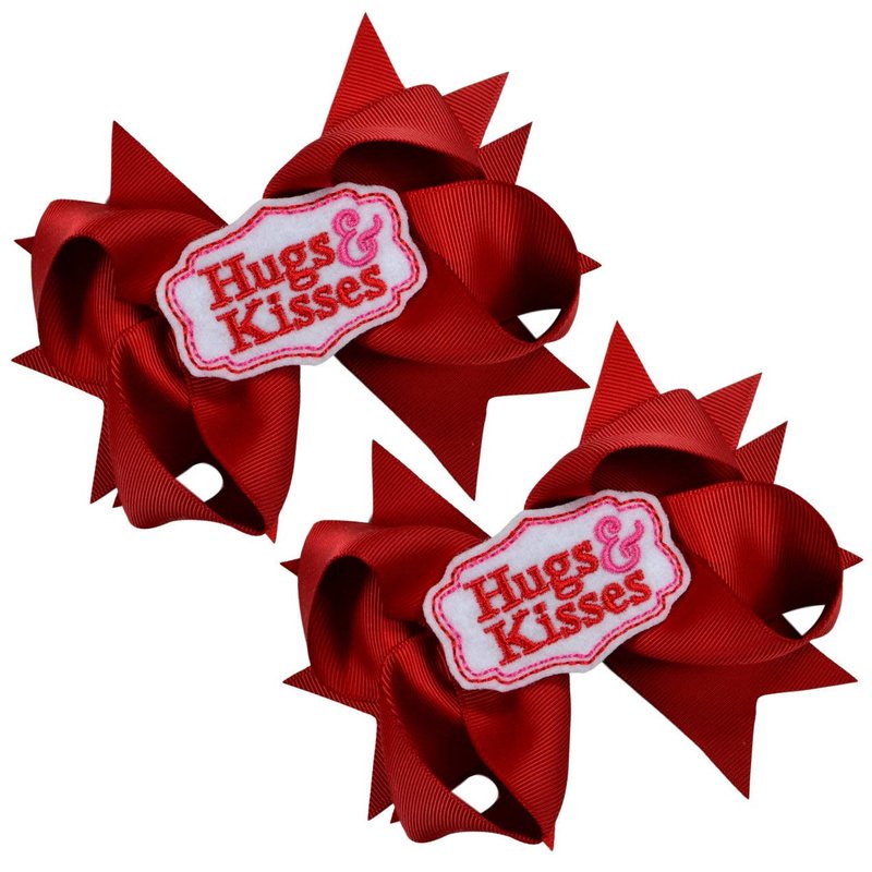 Put a smile in your style! Set of 2 handmade grosgrain ribbon hair bows. In the set you will receive 2 bows and they measure 4.5 Inches in width. Each Bow features a HUGS & KISSES felt Valentines DAY applique. They are attached to a NON slip ribbon lined alligator hair clip. Excellent everyday hair bows!