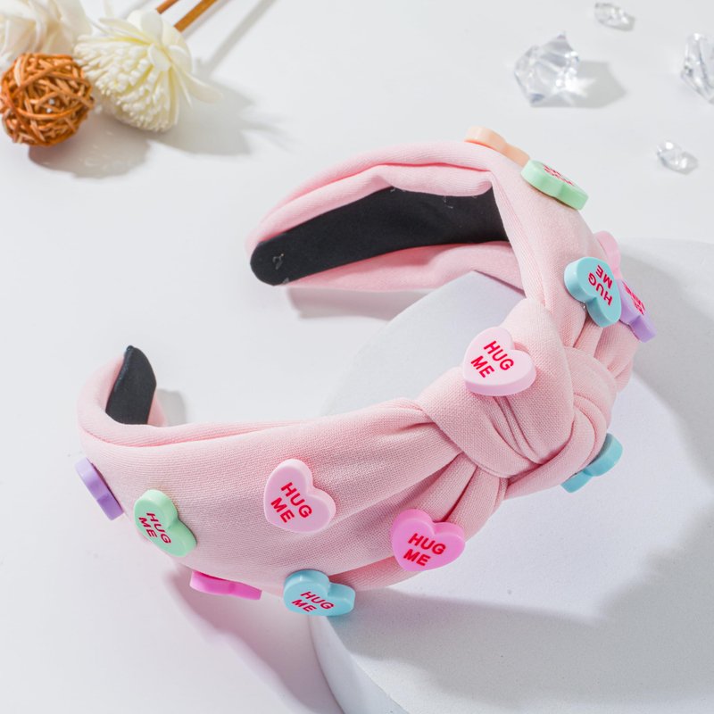 Valentine's Day Heart Candy Embellished Pink Headband Conversation HUG ME Heart Charm Knotted Headband Non Slip Wide Top Knot Fashion Hairband Hair Accessories Party Gift for Women (HUG ME-pink)