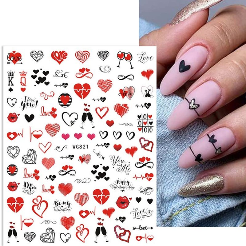- 💑[Valentine's Day Exquisite Design] Valentine's Day nail art stickers have different patterns such as red heart shaped, black heart shaped,red sexy lips, cupid, black red wine cup etc. which can provide you with a variety of choices and let you use your rich imagination to nail DIY. At affordable prices, suitable for girls women fashion styles.