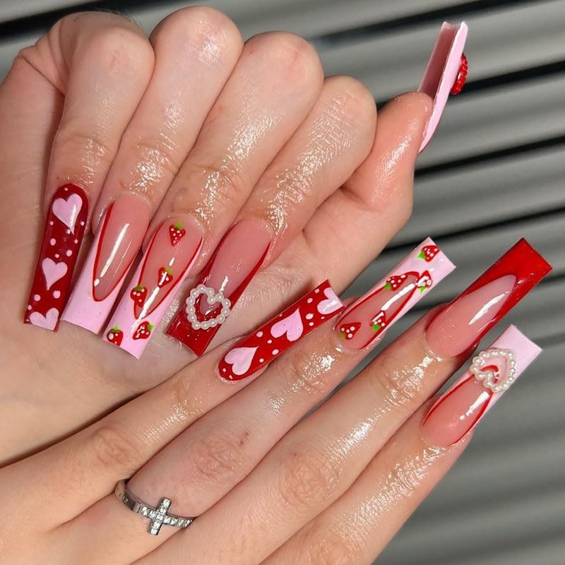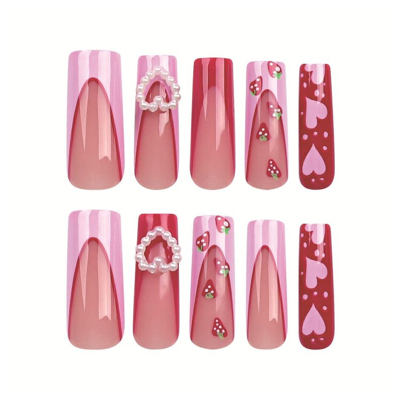 Valentine's Day Press on Nails Long Coffin BAOYAALIN, Cute Pink Fake Nails with 3D Pearls Heart Design Gel Glue on Nails for Women Girls Acrylic Artificial False Stick on Nail for Wedding 24Pcs