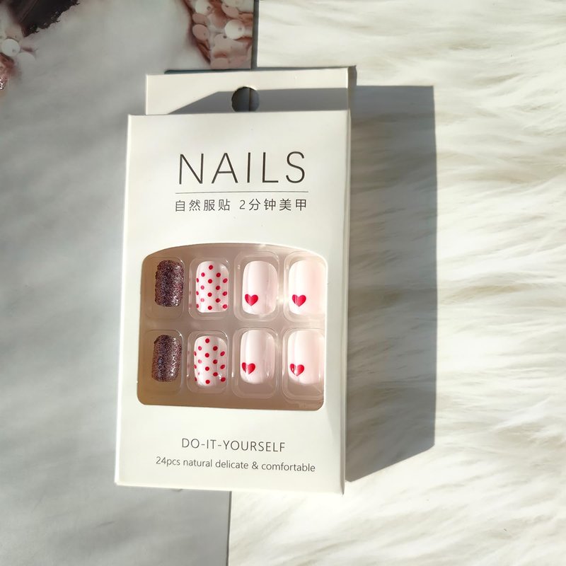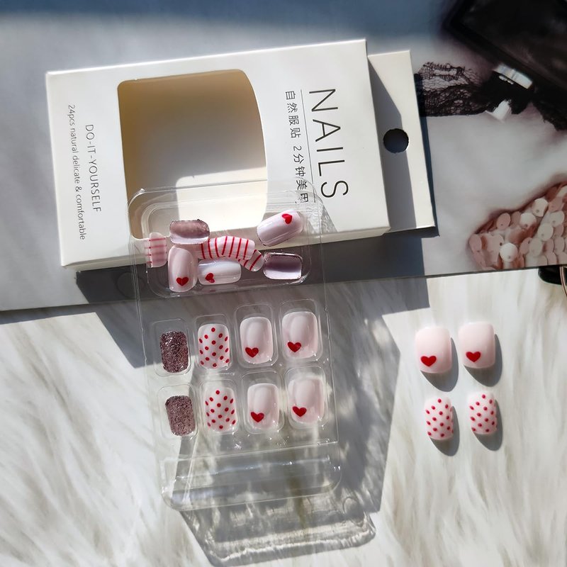 - Package Contents: 24 Pcs short square Valentines fake nails and jelly glue stickers.(Jelly glue doesn't last as long as liquid glue, but it has the advantage of making the fake nail reusable. So I suggest please use suitable glue according to different scenarios)