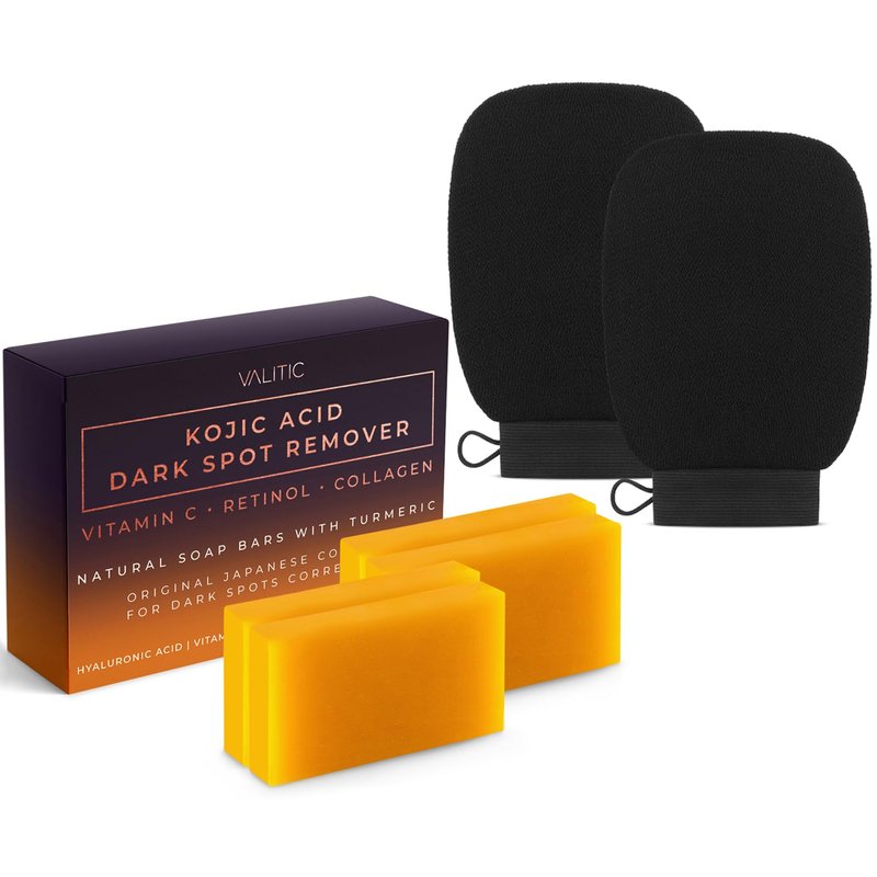 - Dark Spot Corrector - contains Original Japanese Complex Valitic 2 Pack Kojic Acid Dark Spot Corrector Soap Bars with Vitamin C, Retinol, Collagen, Turmeric, Original Japanese Complex Infused with Hyaluronic Acid, Vitamin E, Shea Butter, Castile Olive Oil for dark spot correction; It is an effective way to correct the hyperpigmented areas such as acne scars, facial freckles, and dark spots