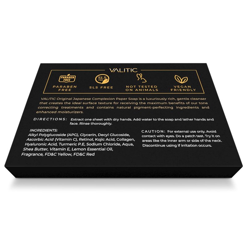 Introducing VALITIC Brightening Lemon & Turmeric Kojic Acid Paper Soap, a transformative skincare essential infused with a potent blend of natural ingredients and powerful actives. This soap harnesses the brightening power of lemon and turmeric, alongside Vitamin C, Retinol, and Collagen, to effectively target dark spots, hyperpigmentation, and uneven skin tone, revealing a radiant complexion. Beyond brightening, it offers comprehensive anti-aging benefits, diminishing fine lines, wrinkles, and sagging skin with Retinol and Collagen. Enriched with Hyaluronic Acid, Vitamin E, and Shea Butter, it provides deep hydration and nourishment, leaving skin soft, supple, and moisturized. Gentle yet effective, it cleanses with Castile Olive Oil, removing impurities without stripping the skin. Packed with antioxidants like Vitamin C, Vitamin E, and Turmeric, it protects against environmental damage, promoting a healthy, radiant glow. Elevate your skincare routine with VALITIC for luminous, youthful-looking skin.