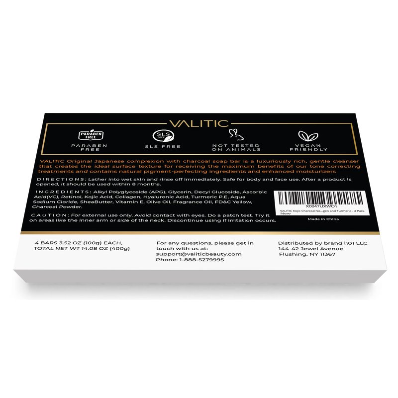 VALITIC Charcoal Kojic Acid Turmeric Black Soap Bar Dark Spot Remover for Body or Face Wash - 4 Pack
