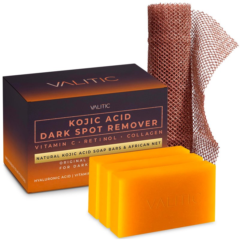 Discover the ultimate solution to dark spots and uneven skin tone with our VALITIC Kojic Acid Dark Spot Remover Soap. Infused with Vitamin C, Retinol, Collagen and Turmeric, this powerful formula hydrates deeply, reducing sun damage and blemishes. Its Original Japanese Complex formulation promotes balanced, glowing skin. Suitable for face, hands, and even sensitive areas like bikini and underarms. Enjoy a complete skincare package with two soap bars and an African Net Sponge for enhanced exfoliation. Free from SLS and Paraben, it's your go-to for daily pampering, leaving skin nourished and revitalized.