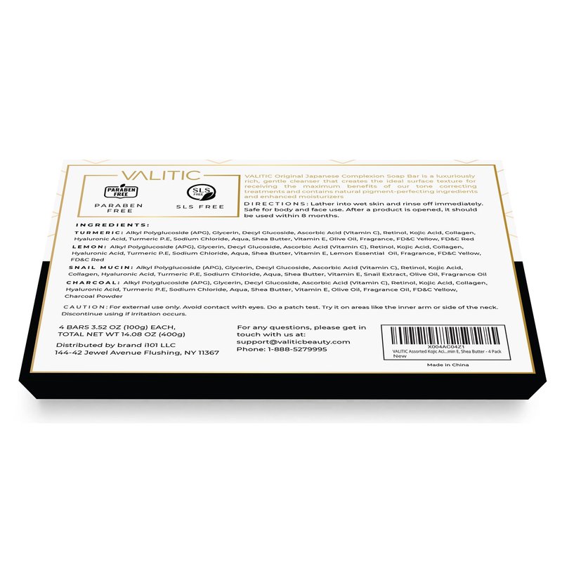 Experience the transformative power of VALITIC Assorted Kojic Acid Soap Bars, your ultimate solution for achieving flawless skin. This 4-pack assortment targets dark spots and hyperpigmentation with potent Kojic Acid and Turmeric, promoting a clearer, more even skin tone. Each bar - Turmeric , Snail, Charcoal, and Brightening Lemon - offers unique benefits, enriched with Hyaluronic Acid, Vitamin E, and Shea Butter for deep hydration and nourishment. Crafted with an Original Japanese Complex, these soaps deliver luxurious cleansing while enhancing your natural radiance. Elevate your skincare routine with VALITIC for visibly brighter and smoother skin.