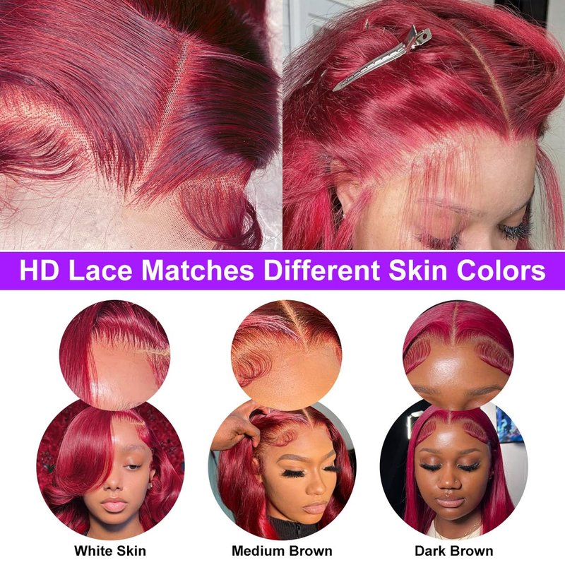 - 99J Burgundy Lace Frontal Wigs Advantage: 13x4 Swiss Lace Straight Wig Around, No Tangle&Shedding Natural, No Smell, 180% Density, 9A Pre Plucked Hairline, Can be Premed, Curly and Restyled