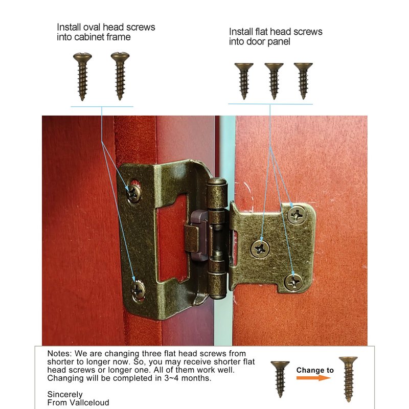 - Screws included: Each hinge come with 5 screws (3 flat head screws, 2 oval head screws). Please drive 3 flat head screws into door panel, Please drive 2 oval head screws into cabinet face. Color of screws is same to hinges.
