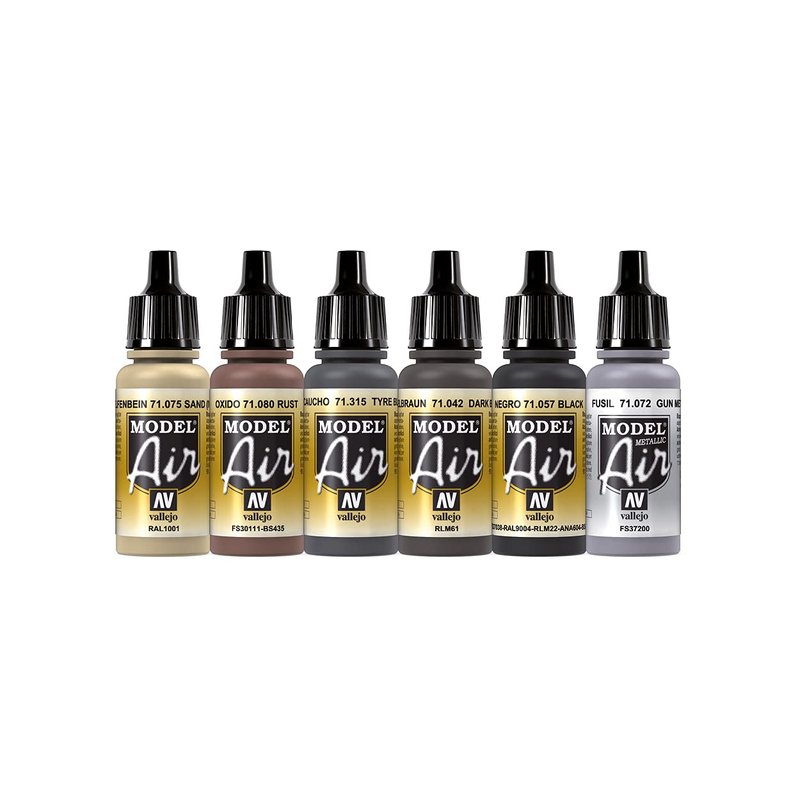 - Acrylicos Vallejo Wheels & Tracks, Model Air Paint Set, 1/2 Fl. Oz. Bottles, 6 Colors