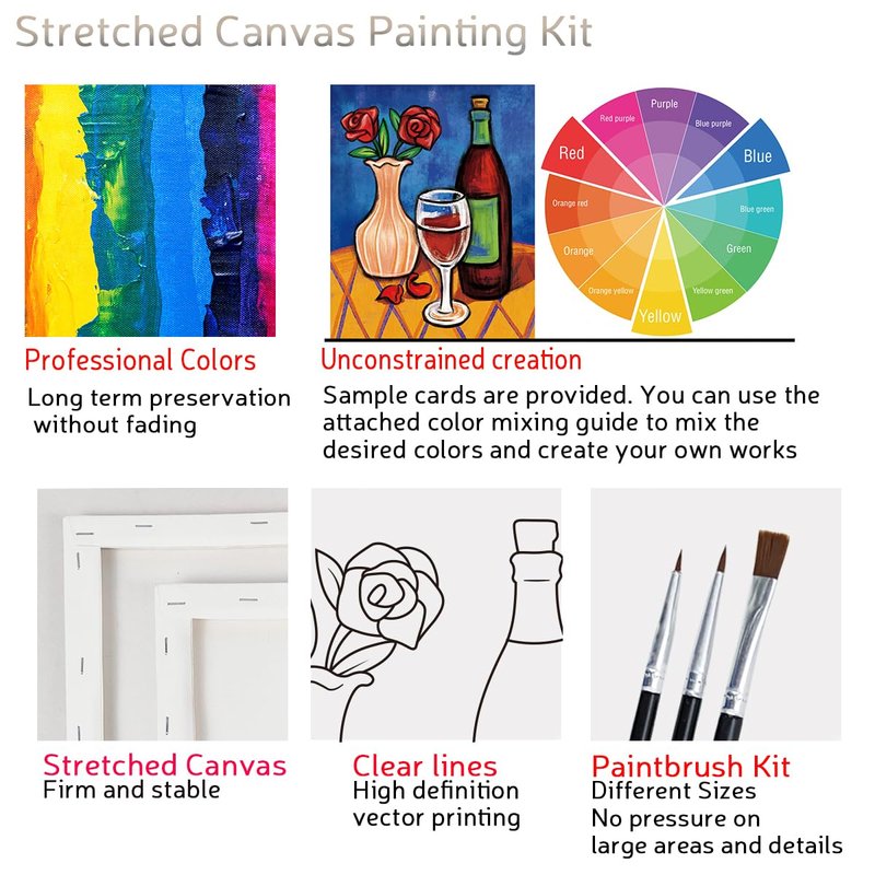 - Stretched Canvas: High-Quality painting canvases are stretched and bound on a dry-treated wooden frame to facilitate stable painting on them. The canvases are pre-printed with clear black outlines.