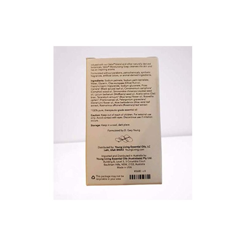 Valor Moisturizing Soap combines the empowering scent of Valor essential oil blend with all-natural ingredients to cleanse, soothe, and moisturize. Size 3.45 o Use as any regular bar soap. For external use only. Store in a cool, dry place. Keep out of direct sunlight and away from ultraviolet radiation sources.z