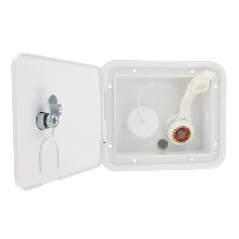 - Gravity/city water lockable hatch that used for filling the water holding tank with gravity (meaning it does not have a threaded connection) or a city water threaded connection with a garden hose.