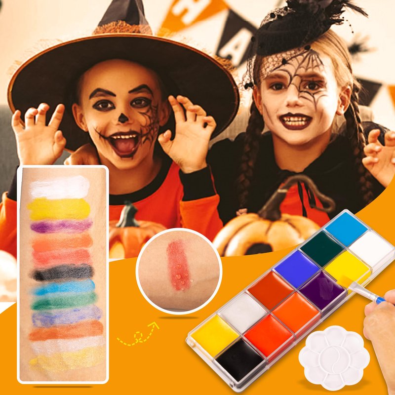 Halloween Makeup Kit Included:12 Color Makeup Paint Oil Based+1 fake blood washable17g+8pcs fake blood capsules+3 Paint Brushes+2 Stipple Sponge+5 Facial Paint Templates+1 Makeup Mixing Pallet.With this sfx makeup kit,you can create amazing special effects that are sure to impress,perfect for creating SFX looks such as Joker,Zombie, Vampire,and Skeleton