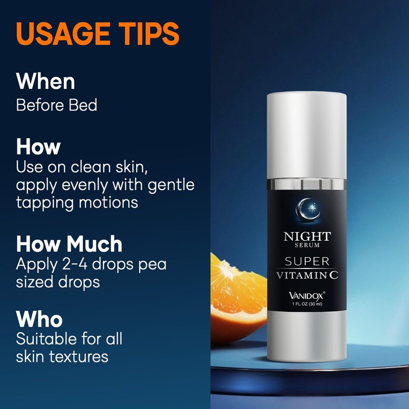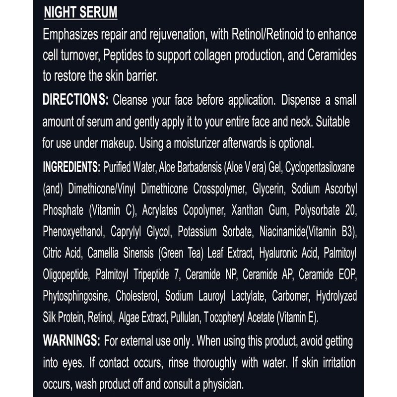 - NIGHT SERUM - Our night vitamin c face serum emphasizes repair and rejuvenation, with Retinol to enhance cell turnover, Peptides to support collagen production, and Ceramides to restore the skin barrier.