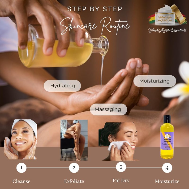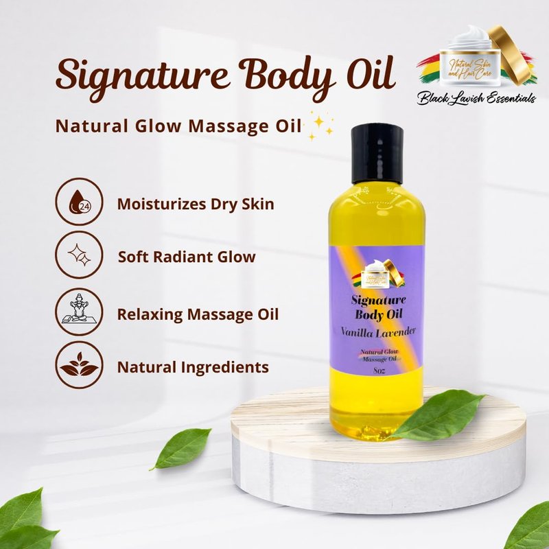 Vanilla Lavender Signature Body Oil, 8oz Natural Glow Massage Oil for Soft Rejuvinated Skin, Aloe Vera, Vitamin E, Argan Oil, Golden Jojoba Oil, Rosehip Oil, Dry Skin Moisturizer Black Lavish Essentia