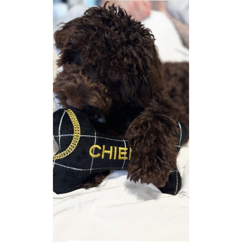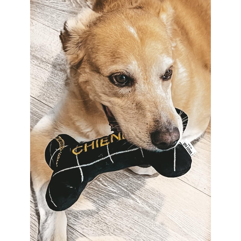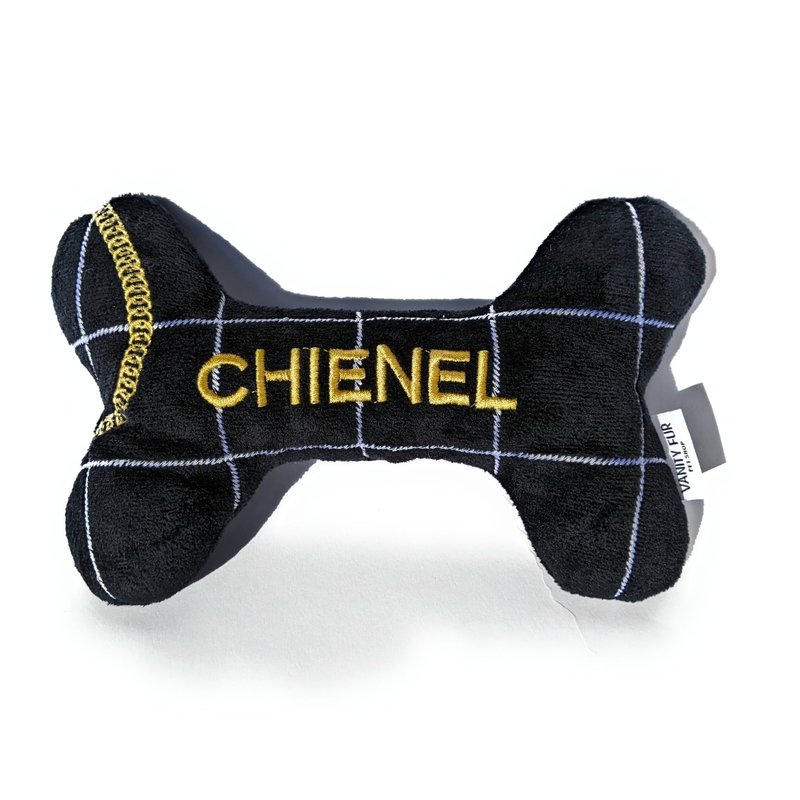 Vanity Fur Pet Shop 2-in-1 Plush Squeaky Dog Toy with Rubber Bone Inside | Interactive & Enrichment Chew Toy for Dogs | Chienel Designer Parody – Black Fashion | Durable, Stuffed & Squeaker Toy