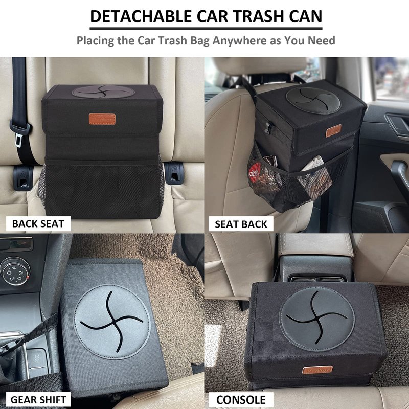 - 【Keep Your Car Clean】- Are you always bothered by the messy of the car interior? Vankor's car trash can with lid will help you to solve this annoyance. This cute car trash can will be helpful for keeping your car clutter-free, ensuring you are in a good mood while driving. Large car trash can with an adjustable strap is hung on the gear shift, glove box, headrest. You can also display the hanging car trash bag on the floor, hanging on the back seat, co-driver seat, or any place in your car.