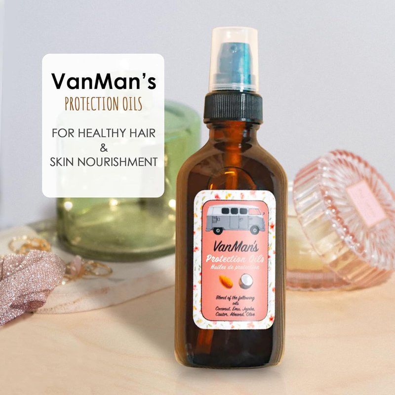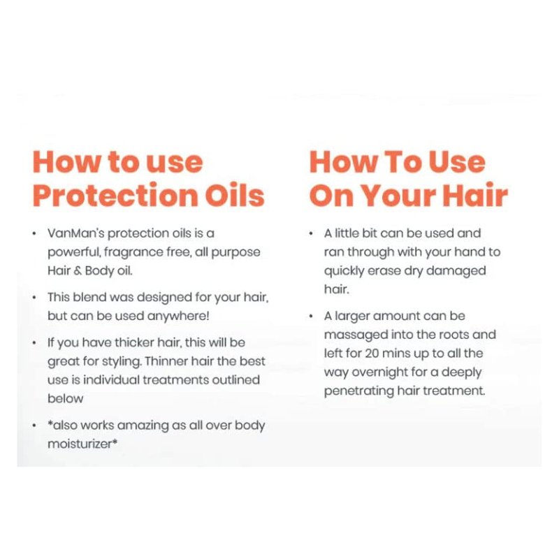 Level up your hair care routine with Vanman's Protection Oil Hair Serum. This advanced formula acts as a superior heat protectant oil, safeguarding your hair from the damaging effects of styling tools while nourishing and revitalizing each strand. Deeply Nourishing Hair Oil With a powerful blend of oils, our oil hair serum is not only a hair smoother for frizzy hair but also serves as a heat protectant oil for hair, safeguarding your strands from the damaging effects of heat styling. Use a little for a boost anytime or a lot for a deep moisturizing experience. Enhanced with Skin-Loving Ingredients This hair care product is enriched with Emu Oil, Golden Jojoba Oil, Castor Oil, Sweet Almond Oil, Cold Pressed Olive Oil and Coconut Oil for hair. How To Use On Your Hair 1. Apply a small amount to dry, damaged hair and run through with your hands for quick touch-ups. 2. For a deep nourishment, massage a generous amount into the roots and leave for 20 minutes or overnight. 3. For optimal results, whip an egg and massage into the scalp to remove the oils, let sit for 10-15 minutes, then rinse out. This coconut hair oil comes with a secure cap and a pump top for easy application. Versatile Body Moisturizer Not just a light hair oil, this hair serum also doubles as a nourishing body oil, leaving your skin feeling soft, smooth, and hydrated. Enhance your hair care routine with VanMan Protection Oils Hair Serum.