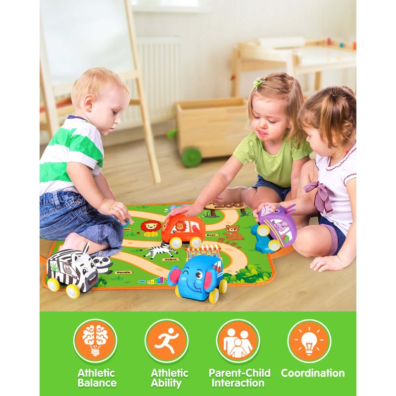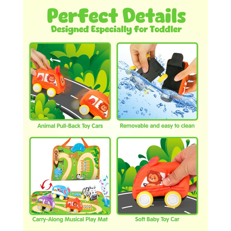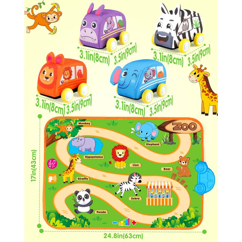 - 1. Interactive Animal Play Set: This set includes 4 soft pull-back animal cars (hippopotamus, elephant, lion, and zebra) and a forest-themed musical mat with 8 animal sounds. Designed to spark curiosity, kids can explore animal sounds, colors, and interactive music for endless learning and fun