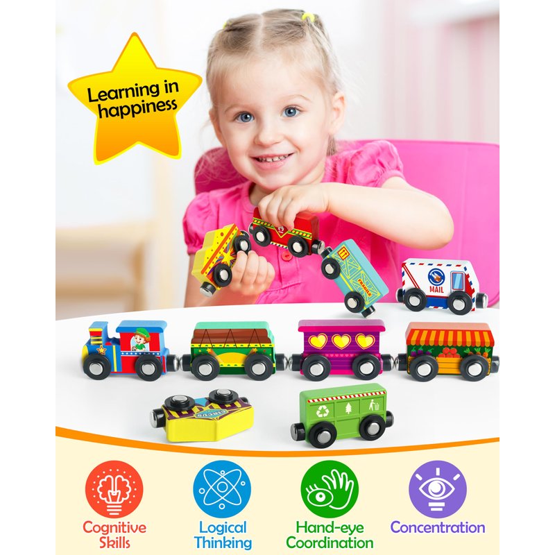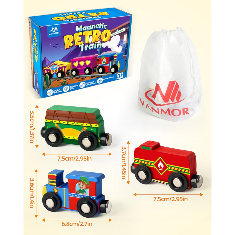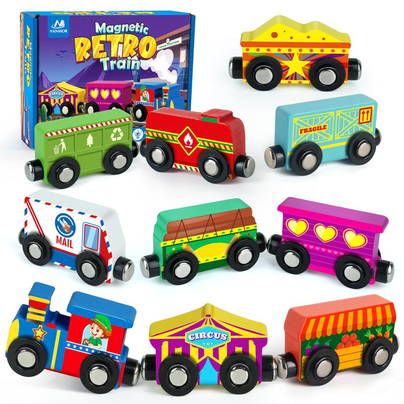 - 1. Diverse Play Experience: Unleash endless fun with Vanmor’s Wooden Magnetic Train Set! This 10-piece set includes 9 career-themed train cars and a durable engine, sparking creativity while boosting fine motor skills. The set is designed to withstand rough play, making it sturdy and durable for young children. A handy storage bag keeps the pieces organized and makes cleanup easy, ensuring hours of imaginative play without the hassle.