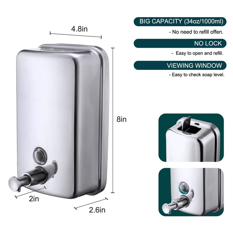 - 【 304 STAINLESS STEEL 】 - High quality 304 stainless steel with nice shining mirror polish , durable, corrosion proof, rust free and anti leak. Suitable for most LIQUID SOAP or GEL HAND SANITIZER which is PH neutral.