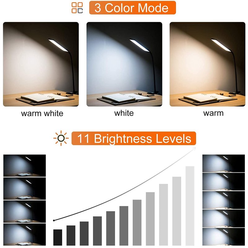 Dimmable desk lamp: 3 light modes(warm white, cool white & warm) and 11 level adjustable brightness