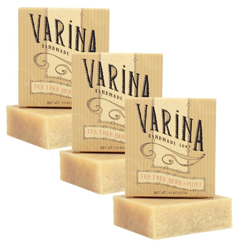 Varina Organic Tea Tree Herb and Mint Bar Soap - Gentle Cleansing for Sensitive Skin, Herbal and Mint - 3 Pack Experience the well-balanced blend of tea tree, rosemary, peppermint, and lavender in our Tea Tree Herb and Mint Bar Soap. This gentle cleansing soap is perfect for sensitive skin and daily use on both face and body. Made with natural and sustainable ingredients, our soap absorbs excess oil, clarifies the skin, and provides gentle exfoliation. Trust Varina for pure, handmade, and sustainable skincare made in the USA using the cold process method.