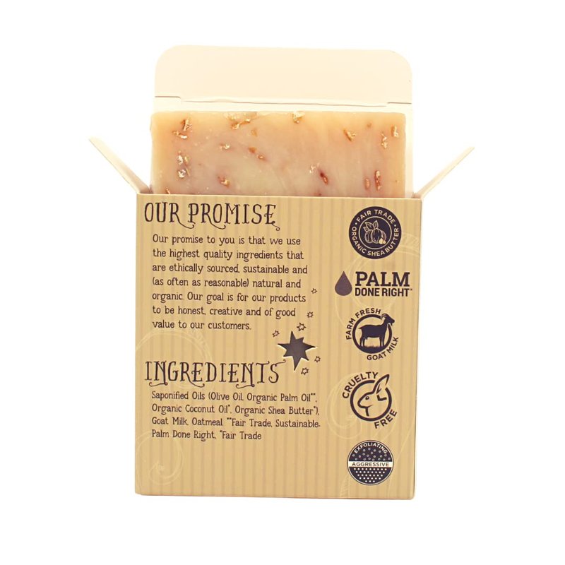 - Exfoliating Oats and Creamy Goat Milk will both invigorate and nourish. Unscented Oatmeal Bar Soap: Gently cleanses, removes impurities and leaves skin feeling refreshed and renew. Farm Fresh Goat Milk, Organic Shea Butter and other pure ingredients will cleanse your skin naturally.