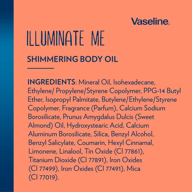 - BEST RESULTS: Apply Illuminate Me Vaseline Shimmering Body Oil after using Vaseline Whipped Body Butter for hydrated and shimmering skin that glows.