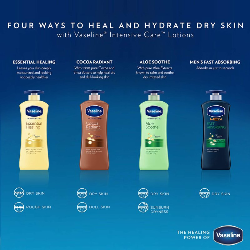 - Vaseline Intensive Care Cocoa Radiant Hand and Body Lotion moisturizes dry skin and dry hands