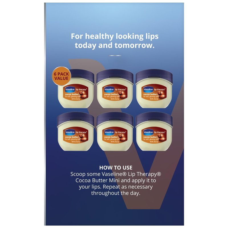 Vaseline Lip Therapy Cocoa Butter Mini, White Petrolatum, Advanced Moisturizer, Relieves Dull and Dry Skin, Mini Vaseline Petroleum Jelly, Soft & Smooth Vaseline Lips (Pack of 6-0.25 Oz Ea)