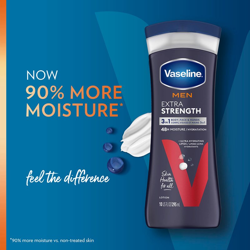 Vaseline Lotion for Dry Skin - Men Extra Strength Lotion, Fast-Absorbing Body Lotion Jelly and Ultra-Hydrating Lipids, 3-in-1 Body, Face, & Hands, 10 Oz Ea (Pack of 2)