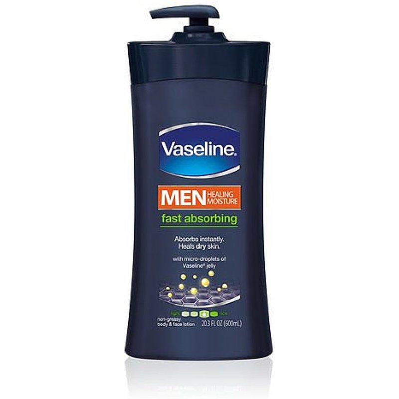 - Vaseline Men Healing Moisture Fast Absorbing Body Lotion absorbs in 15 seconds to heal dry skin