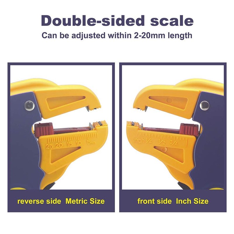 Stripping diameter can be adjusted automatically for different wire cross sections. With adjustable length stop, with a spring returns the stripper to the starting position, long lifetime. Automatically adjusting to the wire size. A Simple adjustment Dial for blade pressure according to the thickness of insulation.