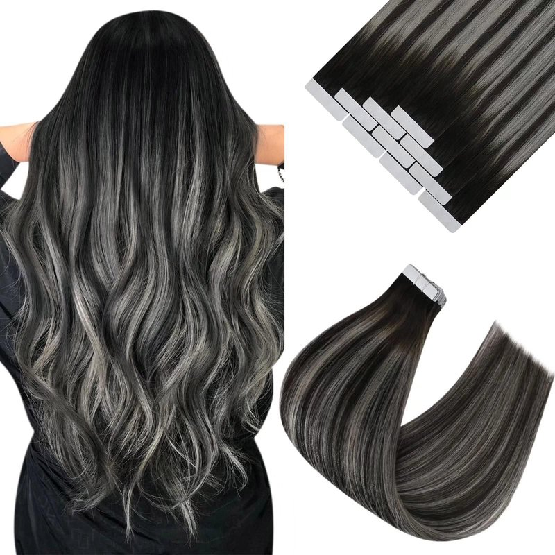 Ve Sunny Tape in Hair Extensions 24inch Balayage Hair Tape in Extensions Black Ombre Grey Invisible Tape in Hair Extensions Real Human Hair Balayage Natural Black Mix Silver Grey 25g 10pcs