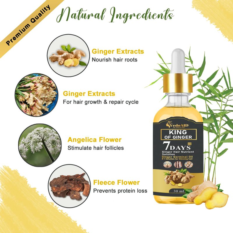 - Regain your confidence with VedoAID 7 King of Ginger Hair Oil, the natural and effective solution for promoting hair growth and rejuvenating your hair's vitality. Experience the transformation and unlock the secret to lush, vibrant hair today.