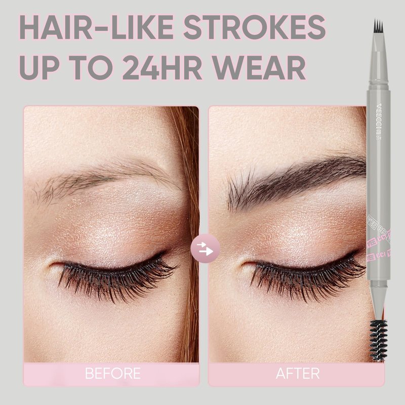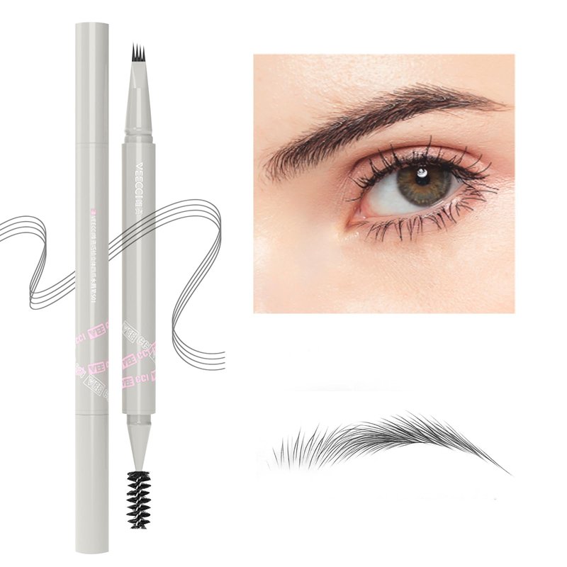 VEECCI Liquid Eyebrow Pencil, Long-lasting Waterproof Fork Tip Grey Brow Pen with Brow Brush, Double Ended - Smudgeproof and Tattoo Microblading Effect